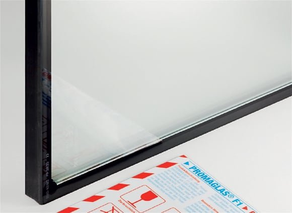 PROMAGLAS® EW1 a F1 jsou požárně ochranná skla tvořená 2 tabulemi tepelně tvrzeného skla (ESG) a vnitřní čirou protipožární hmotou, která se zahřátím při požáru aktivuje a zajišťuje celistvost a izolační schopnost.